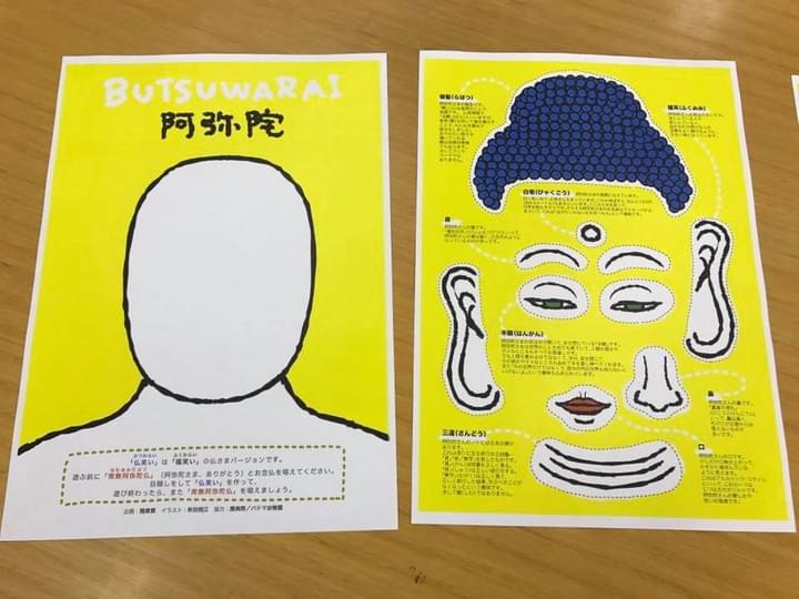 「福笑いの阿弥陀さまバージョン」。阿弥陀さまの顔のパーツ(「半眼」「白毫」「福耳」「三道」「螺髪」 など)には、それぞれ意味や物語があります。それらの解説文がついているので、遊びながらいつのま にか、いにしえの文化に触れることができる…という画期的(?)な福笑いです。